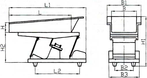電磁振動給料機的振幅和給料量受料倉倉壓影響較大,設(shè)計料倉時應(yīng)盡量減少倉壓,使溜咀后側(cè)板承受一定的倉壓,并設(shè)置斜溜沮及下料閘門。如圖,一般a=1/4b。溜咀四周應(yīng)與給料槽留有一定的間隙,一般5~10mm,以免產(chǎn)生噪音及影響振動。