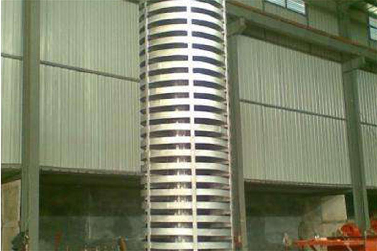 垂直振動(dòng)輸送機(jī)是通過(guò)激振器強(qiáng)迫振動(dòng),使輸送塔作沿垂直方向的直線振動(dòng)和繞鉛垂中心軸的扭動(dòng)振動(dòng),兩個(gè)振動(dòng)的合成,使物料朝 螺旋運(yùn)動(dòng)的方向斜拋,形成了物料沿螺旋槽向上的輸送過(guò)程。垂直振動(dòng)輸送機(jī)是由提升槽、振動(dòng)電機(jī)、減振系統(tǒng)和底座等組成。垂直振動(dòng)輸送機(jī)分開(kāi)槽式、封閉式兩種結(jié)構(gòu)。
